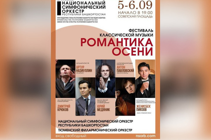 5 и 6 сентября в столице Башкирии пройдет опен-эйр фестиваль классической музыки «Романтика осени», местом проведения которого станет Советская площадь. Событие пройдет при поддержке Радия Хабирова, правительства Башкирии и минкультуры республики.