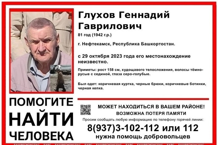 В Нефтекамске волонтеры продолжают поиски 81-летнего Геннадия Глухова, который пропал 29 октября. В этот день дедушка ушел в аптеку, но так до нее и не дошел, сообщили в поисковом отряде «БашРегионСпас».