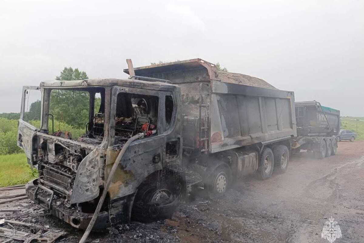 Кабина автомобиля Scania, который перевозил щебень, полностью выгорела. Пострадавших нет.