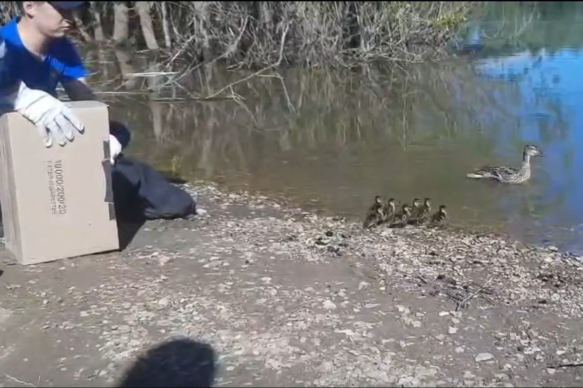 Прибывшие на место специалисты отловили утку с утятами и выпустили в безопасном месте у воды.