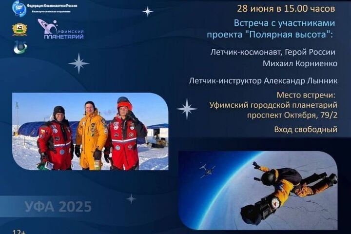 Мероприятие в рамках проекта «Полярная высота-2025» запланировали на ноябрь этого года. Кроме того, уфимцы смогут узнать о том, как проходил первый в мире прыжок из стратосферы на Северном полюсе. Он состоялся в апреле прошлого года и посвятили его 450-летнему юбилею Уфы.