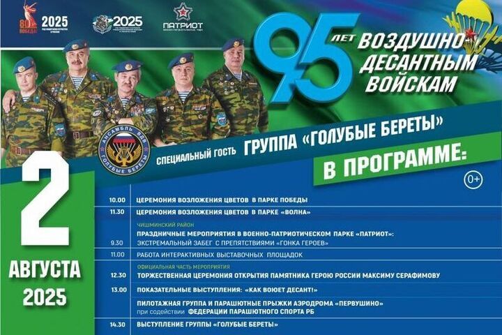 Так, в 10 часов утра в парке Победы и в 11:30 в парке «Волна» пройдут церемонии возложения цветов. В парке «Патриот» в 9 часов утра ветераны ВДВ примут участие в забеге «Гонка героев», а в 11 часов начнут работу интерактивные площадки. Гости праздника могут посетить выставки поисковых отрядом, мастер-классы по плетению парашютных сетей и браслетов, оказанию первой помощи, авиамоделированию. В честь 95-летия ВДВ состоится открытие памятника Герою России Максиму Серафимову.
