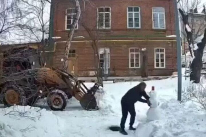 На запись камеры видеонаблюдения попала работа экскаватора-уборщика. Водитель занимался очисткой двора от снега и заметил стоявшего на обочине снеговика. Остановив машину, он вышел и перенес снежного человечка в безопасное место, шутливо пригрозив ему пальцев. После этого он продолжал работу.